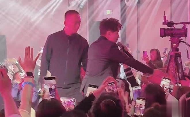 林志颖拿着话筒,站在台上为粉丝献唱自己的成名曲《十七岁的雨季》,台下的粉丝激动又开心,为了安全问题,安保人员也站在台上陪同林志颖,林志颖特别有亲和力,一边唱歌一边跟台下的粉丝握手互动,心情十分不错。